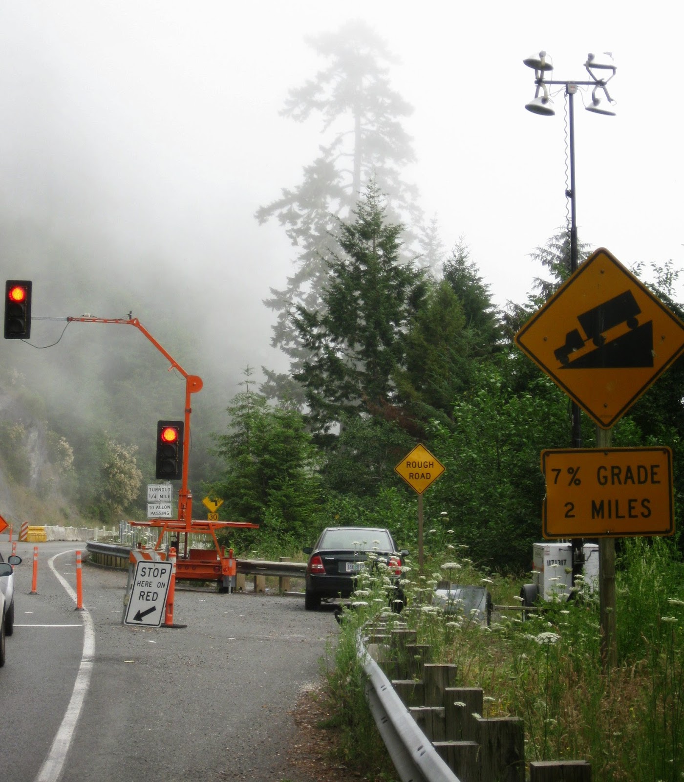 It can be risky business cycling on the Redwood Highway. South of Crescent City a construction stop light stopped me at the bottom of a steep climb. As cars lined up behind me, I observed the oncoming traffic pass through 1 tight land that curved between the construction and a rock face that blocked my view around the corner. The light turned green so I let cars go before me so as not to hold anyone up behind me. But then the light turned yellow so I had to move fast to beat the the green light in the other direction- it was impossible to know how far it was beyond the blind corner to the other light, where I could get caught out against oncoming traffic.
